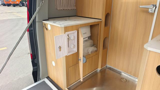 若車(chē)上的電磁爐無(wú)法滿足需求,我們還可以外接家庭版的電磁爐,其下方的220v電源插座就是為此而設(shè),另外兩個(gè)儲(chǔ)物柜雖然不大,但擺放一些日常的袋裝物品綽綽有余,易碎物品則需另外安置。